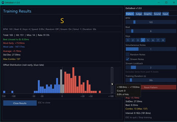 - Training mode — Timed sessions with detailed results including average offset, standard deviation, best hit, and offset distribution chart
